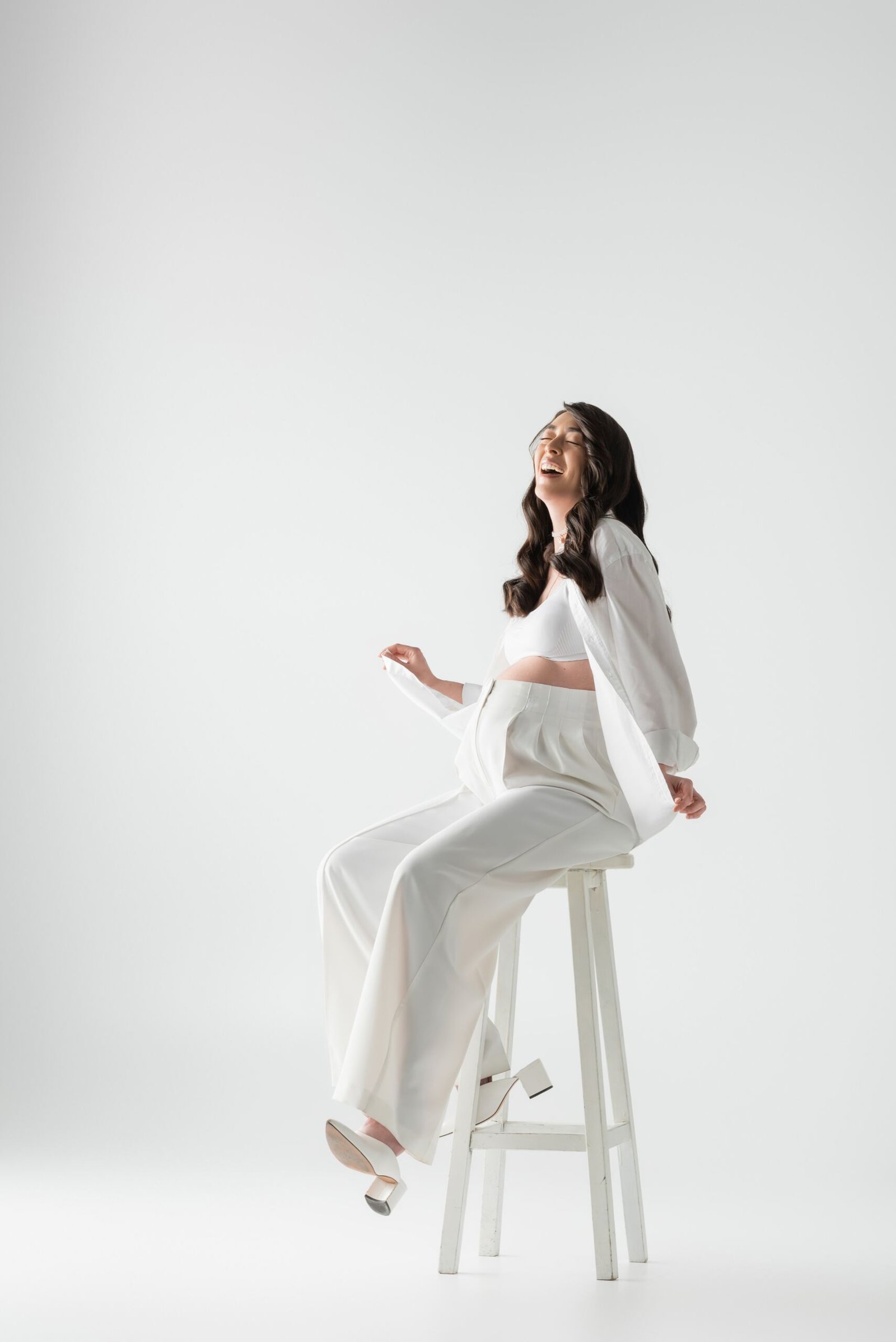 Du willst deinen nackten Babybauch zeigen? Dann sind enganliegende Bodys oder Crop-Tops mit High-Waist-Hosen oder Röcken eine tolle Option. Das funktioniert besonders gut für moderne, puristische Shootings in klarem Licht.